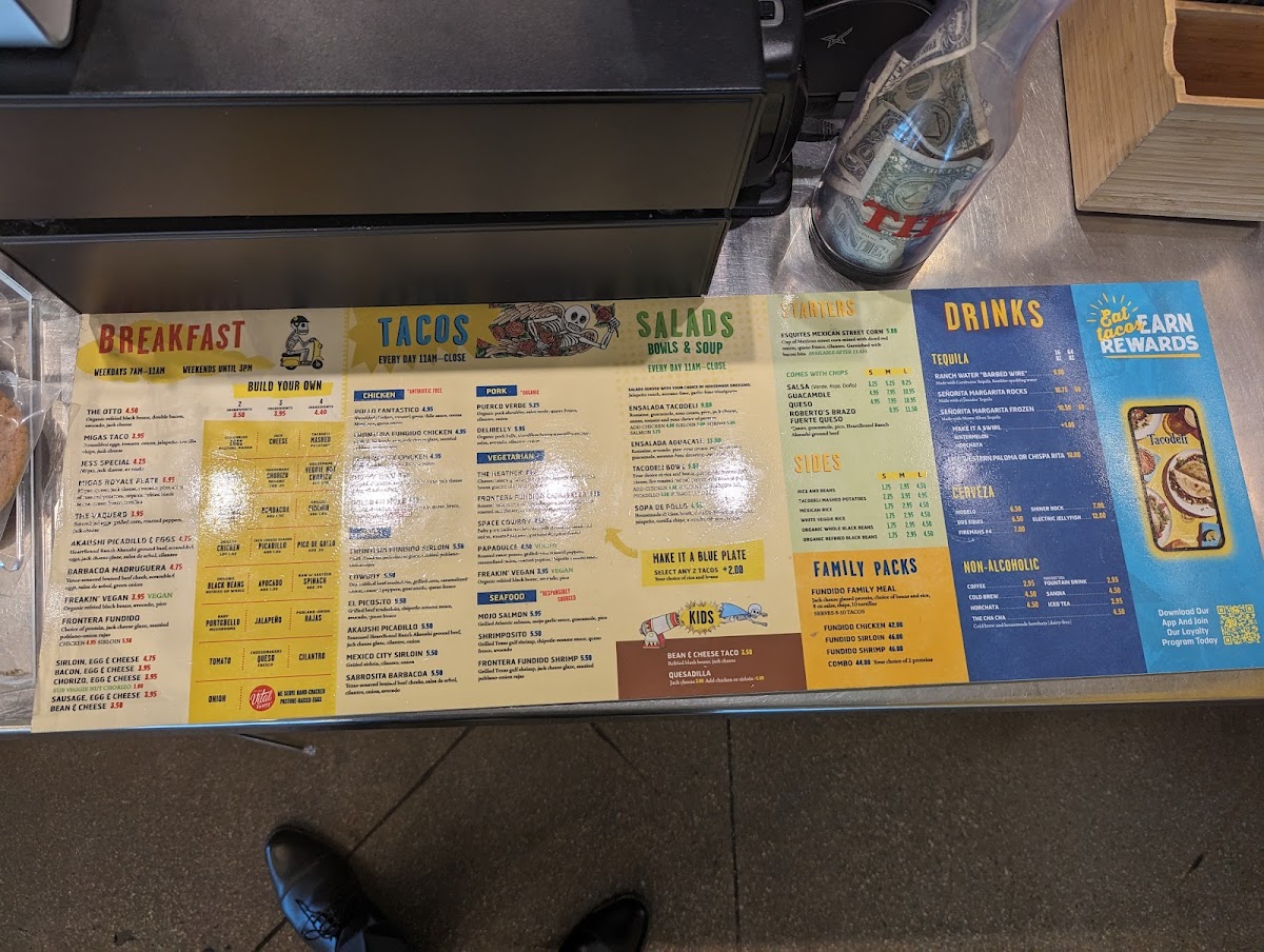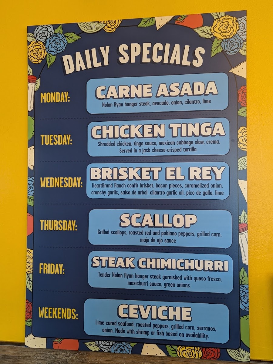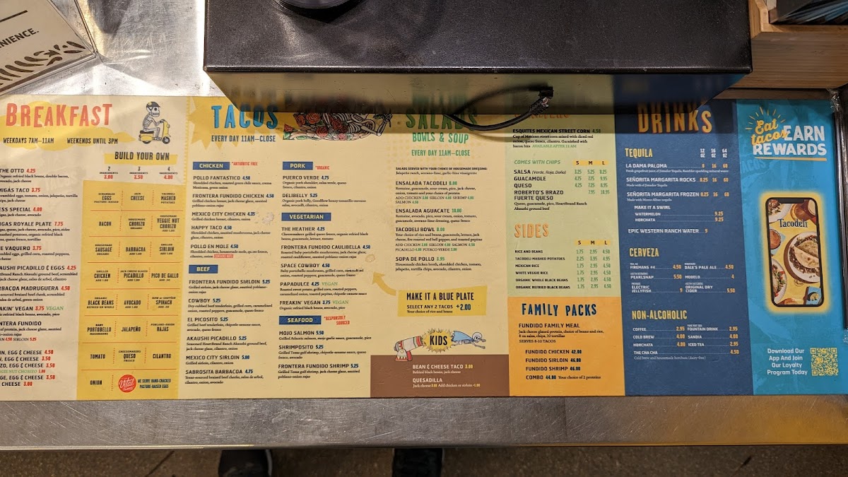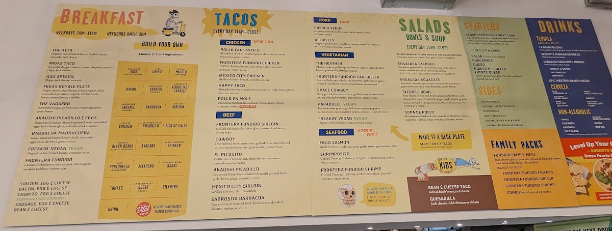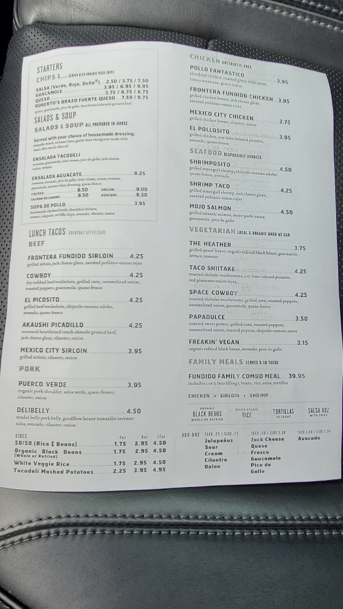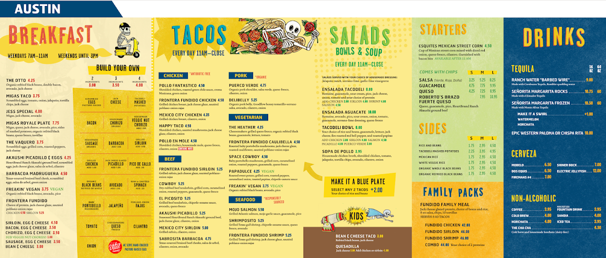 Introducing the menu at Tacodeli, a vibrant taco haven located in Austin, TX, where flavor and freshness shine. The menu offers a delightful mix of tacos, featuring delectable options like the Borracho Carnitas, Mojo Salmon, and the crowd-favorite FRONTERA FUNDIDO SIRLOIN. Each taco is crafted with high-quality proteins and complemented by an array of salsas that elevate the taste experience.